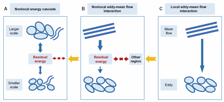 海洋中不同空间尺度的运动之间存在复杂的能量传递过程。传统观点通常认为,较大空间尺度的海洋运动蕴含的动能会传递给局地小尺度运动。然而,该研究表明,在波数域中,全球海洋表层动能串级并不总是局地闭合,而是普遍呈现显著的空间非局地性:大尺度流动释放或获得的动能不会完全转化为局地小尺度动能,其中一部分能量可经由剩余动能库在空间上重新分配到其他区域。