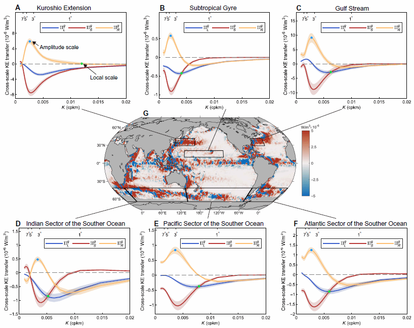 图2 全球海洋动能串级不平衡的区域特征与空间分布。(A–F) 黑潮延伸体、副热带环流、湾流及南大洋不同子区域中跨尺度动能传递的波数域特征;(G) 3°分离尺度下动能串级不平衡项的空间分布,显示黑潮延伸体、湾流等高能区存在显著空间非局地动能串级。